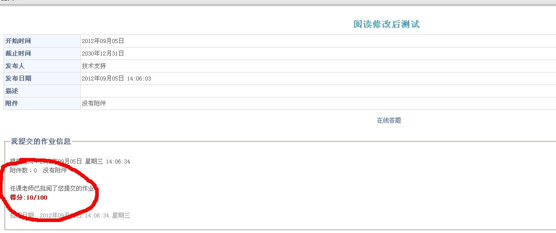 答:在作业页面如果你能查看到自己的成绩(如下图标注出的地方会显示出成绩),证明之前你已经完成过该作业,当然如果对于成绩不满意的话,是可以重新作答的。(如下图)