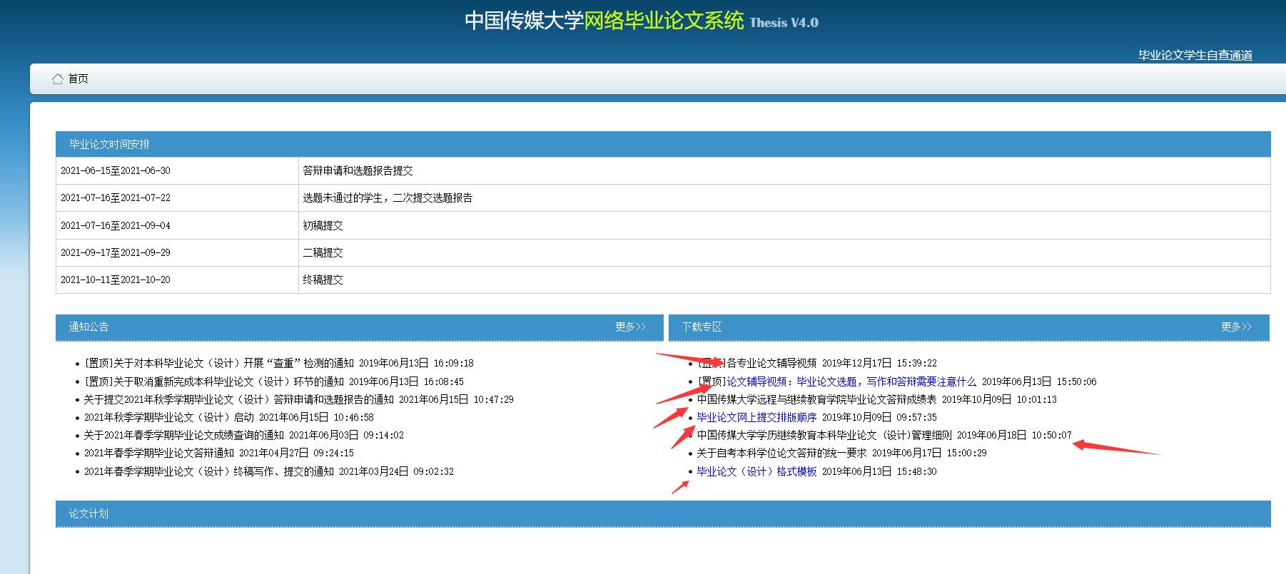 2、进入论文系统后,请务必认真查看下图中红色箭头的内容: