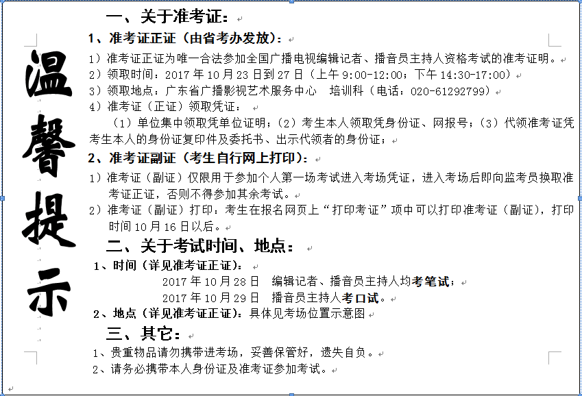 2017年全国广播电视编辑记者、播音员主持人资格考试广东考区温馨提示