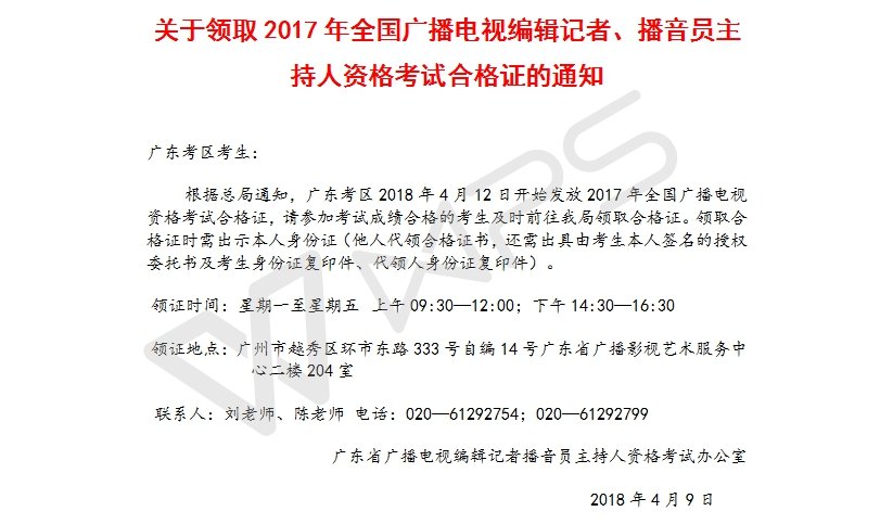 关于领取2017年全国广播电视编辑记者、播音员主持人资格考试合格证的通知